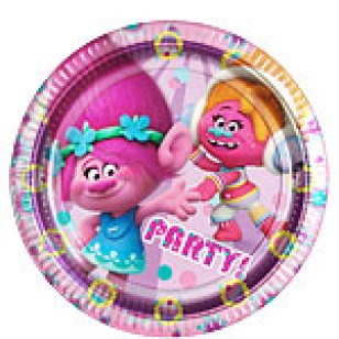 Kartonski krožniki z motivom Trolls, 23 cm, v paketu 8 kosov.