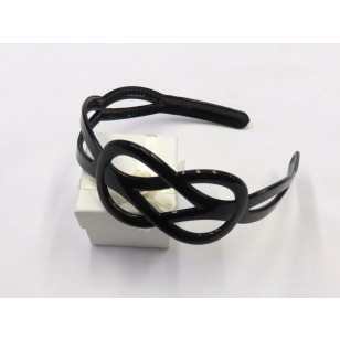 Plastičen obroč z okrašenim širšim delom, ki spominja na znak neskončno in dvojnim prepletenim stranskim delom. Črne barve, svetleča kvalitetna plastika.