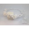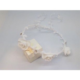 Čudovit venček za lase za svečane priložnosti. Obroč oblečen v bel trak z okraski iz rožic in kamenčki. Zadaj dve padajoči vrvici. Brez dodatkov.